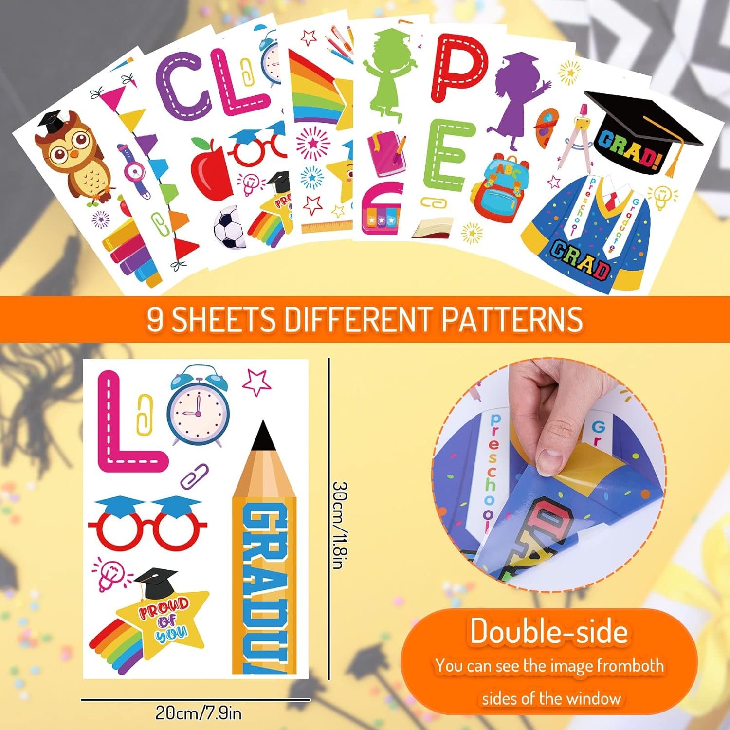 What You Will Get – 9 sheet preschool graduation window decals are included in the package, unique and festive design makes them great decoration for your classroom and home. Each sheet is 20 x 30cm/7.9 x 11.8 inch.